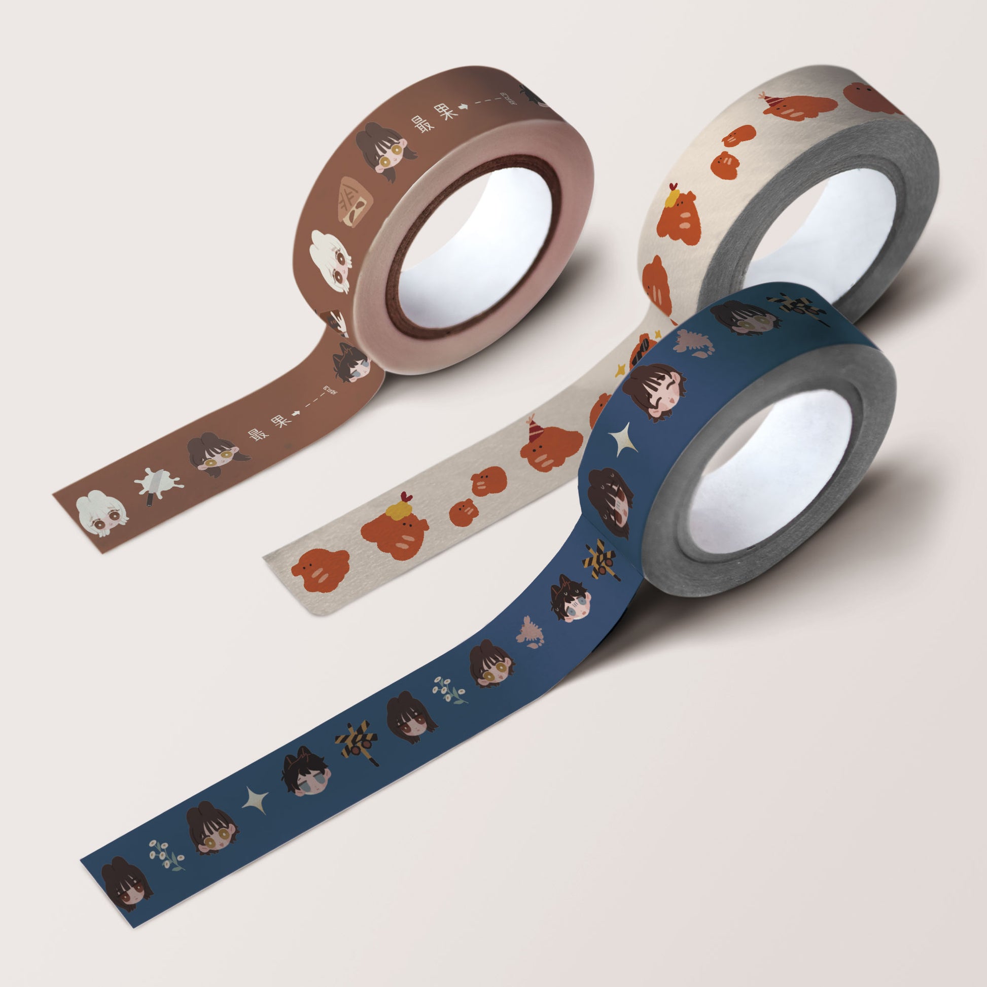 「さいはて駅」「黄昏電鐵」「びぶたこ」をテーマにしたマスキングテープです。それぞれの世界観やキャラクターをモチーフにデザインし、落ち着いた色合いで仕上げました。ノートや手紙、デコレーションなど、日常使いにもおすすめです。